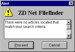The message is clear and understandable, but the choices are ambiguous. This error message is displayed by ZDnet's File Finder, when a keyword search has failed to locate any matches. Having a choice where none would seem necessary creates uncertainty.