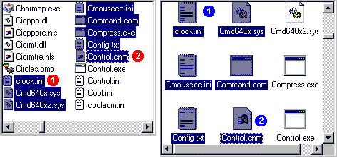 ![]() If you really want to confuse your users and make it difficult for them to learn how to use your application, occasionally change the rules under which the controls operate in your application. Explorer does just this in its multiple selection method. Usually, you select a continuous range of items within a list by clicking on the first item, then clicking on the last item in the range while holding the Shift key down. All items between the two will then be selected. This is the standard method of multiple selection in Windows, and the standard method of multiple selection in Explorer as well, as long as you are not using either of the Icon views. In the figure, the left panel represents the List view in Explorer, and the right panel represents the Small Icon view of the same folder. In both panels, the file labeled 1 was selected first, and the file labeled 2 was Shift-selected second. Notice however, that the range of files selected by each is different. When in either of the Icon views, Explorer selects those objects that fall within the imaginary rectangle bounded by the two selected objects. All we can ask is 'Why?': for what purpose would Microsoft make the same selection method yield different results? They switched the rules in the middle of game and here are the likely results: