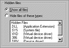 Win95's Explorer allows you to exclude certain file types from being displayed. That's nice. Unfortunately, they don't allow you to chose which types can be excluded; you either exclude no files, or you exclude all of the files in a set predefined by Microsoft. That's not nice. Developers for example, are often interested in .DLL files, but to have them displayed, they also have to display .DRV, .VXD, .SYS, and .386 files, all of which are meaningless to all but the most sophisticated propeller-heads.